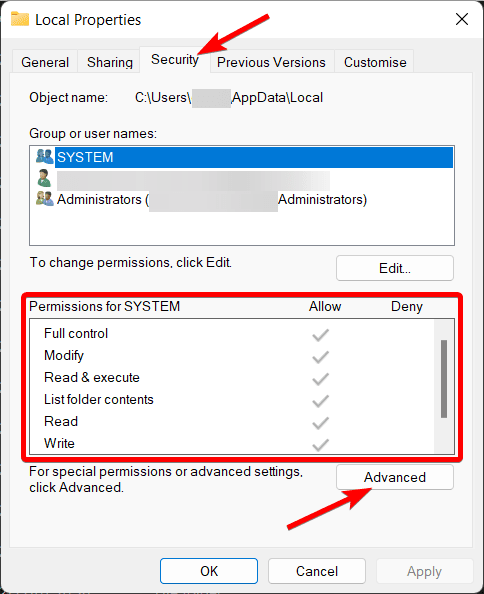 In the Local Properties window, open the Security tab, then check that the Permissions for System are all set to Allow. If they are not all set to Allow, or you don’t see your User profile at the top, click on Advanced.