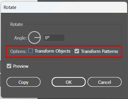 To use this method, double-click the Rotate Tool in the Tools panel to open the Rotate dialog box. Deselect the Transform Objects option and select the Transform Patterns option. This will allow you to rotate only the pattern within the object. Click and drag on the rotate icon in the panel to turn the pattern or type in an exact degree amount in the Angle input box.