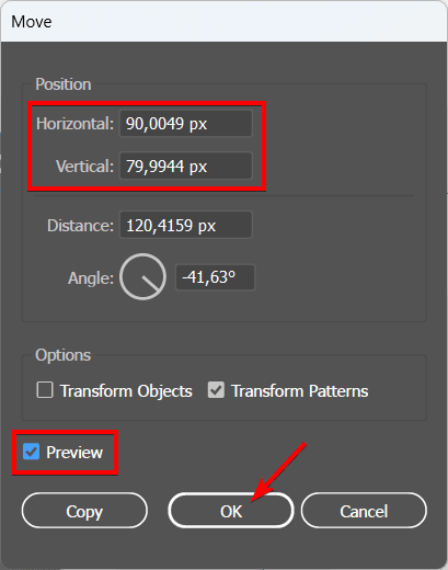 The Move Tool is another way to move patterns within an object using a dialog box. You can use it to change the position and alignment of the pattern with specific values. To use this method, double-click the Selection Tool in the Tools panel to open the Move Tool dialog panel.