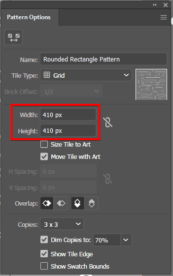 In the Pattern Options panel, you can name your pattern, choose the tile type, adjust the size and spacing, and change the alignment and overlap of the pattern. You can also see how the pattern will look in different modes, such as dimmed or outlined.