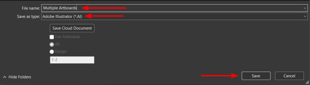 Name the file, choose the destination, and set the format to an AI file. Click Save.