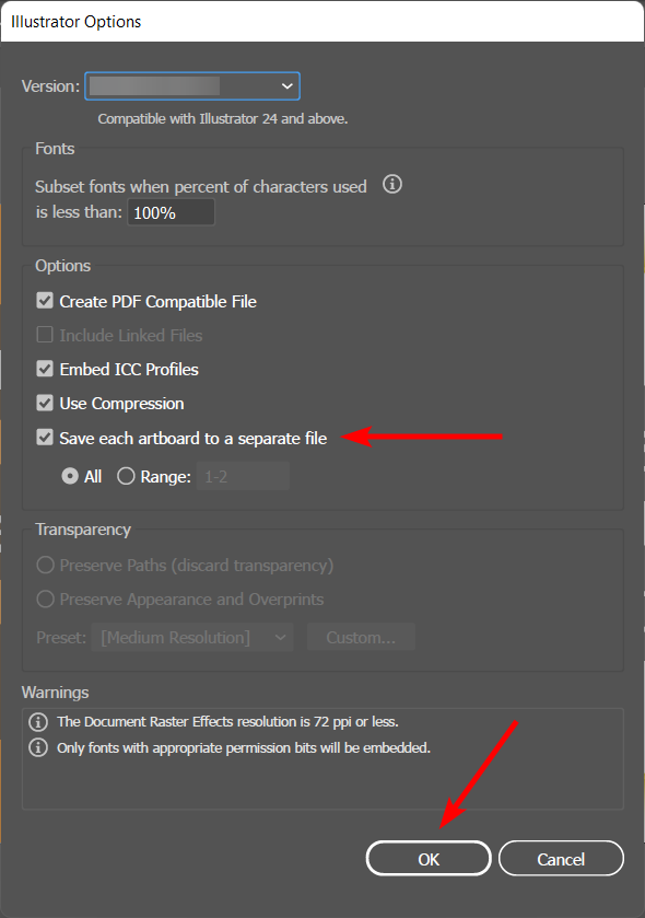 - Check the box next to Save each artboard to a separate file