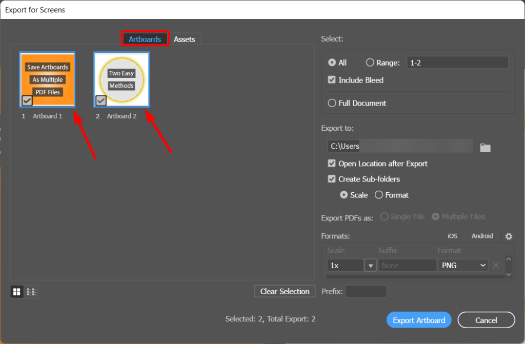 - Select the Artboards to Export
