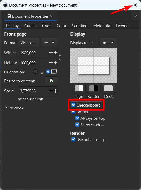 To add the checkerboard pattern, click the checkbox next to Checkerboard. Then, exit the window by clicking on the X at the top.