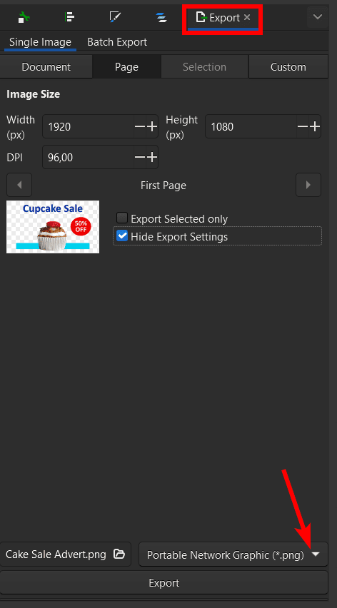 The Export panel will open on the right-hand side of the workspace. Here you can set the image size and location and choose the file type. To keep the background transparent, the setting you need to focus on is the file type drop-down list at the bottom of the panel.